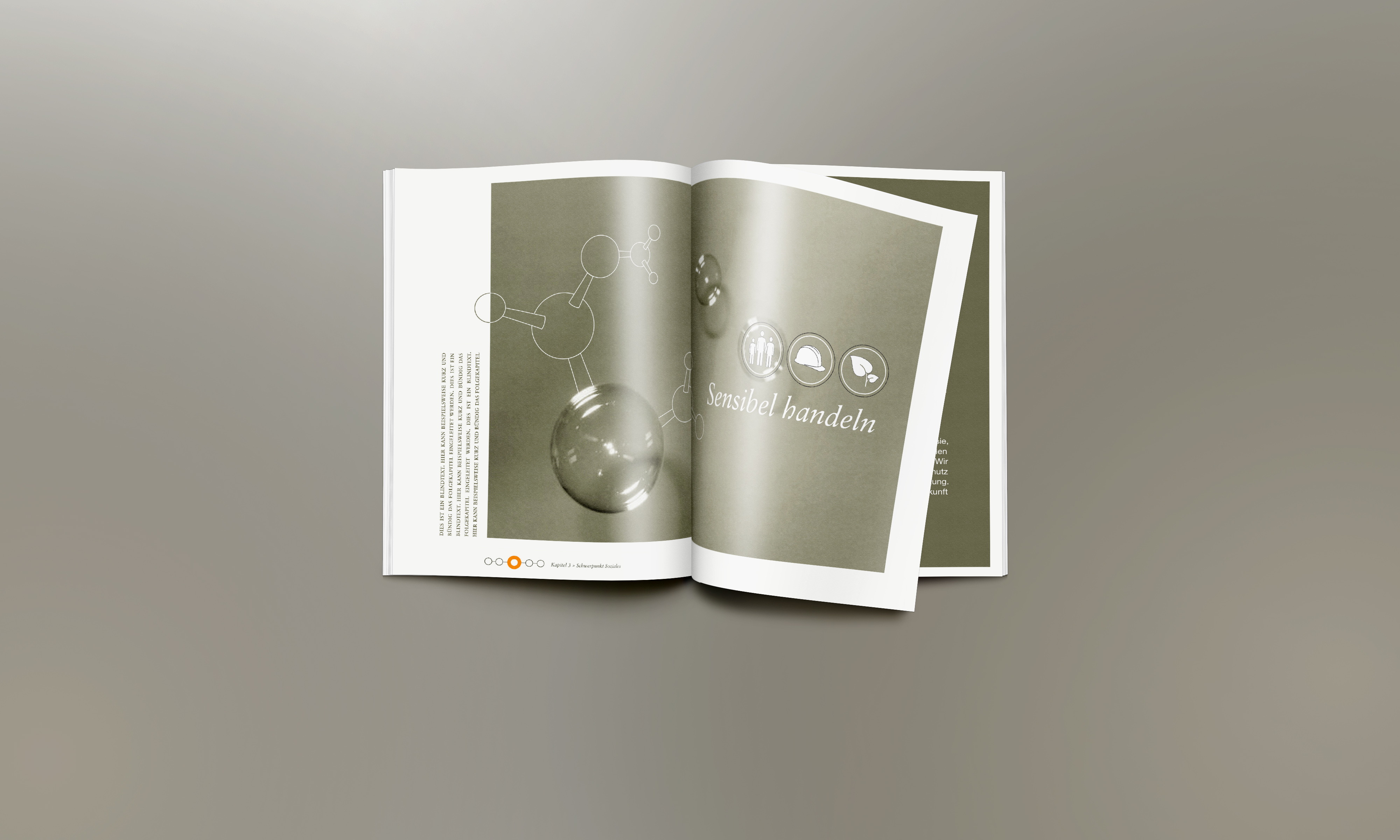 Für die BASF SE entsteht innerhalb meines Diplom-Semesters ein umfangreiches Berichtskonzept, das die Haltung des Konzerns eigenständig und hochwertig zum Ausdruck bringt. Tragende Berichtsidee: Neben sämtlichen Fotomotiven basiert ein Großteil grafischer Elemente auf Molekülstrukturen.